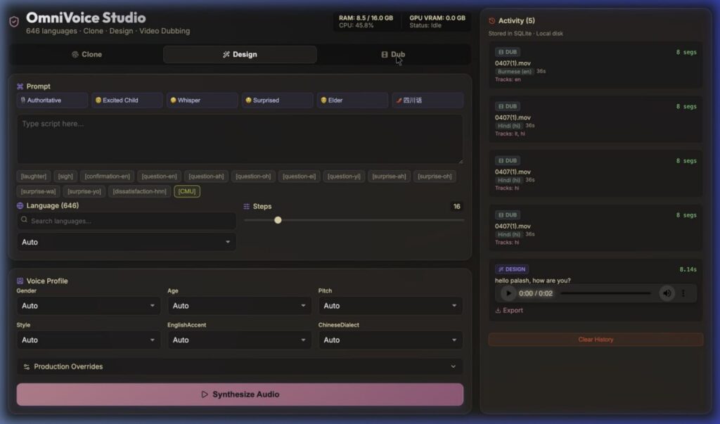 OmniVoice Studio — локальная студия для дубляжа, клонирования голоса и работы с аудио. Всё работает без API-ключей и облака, прямо на вашем железе.